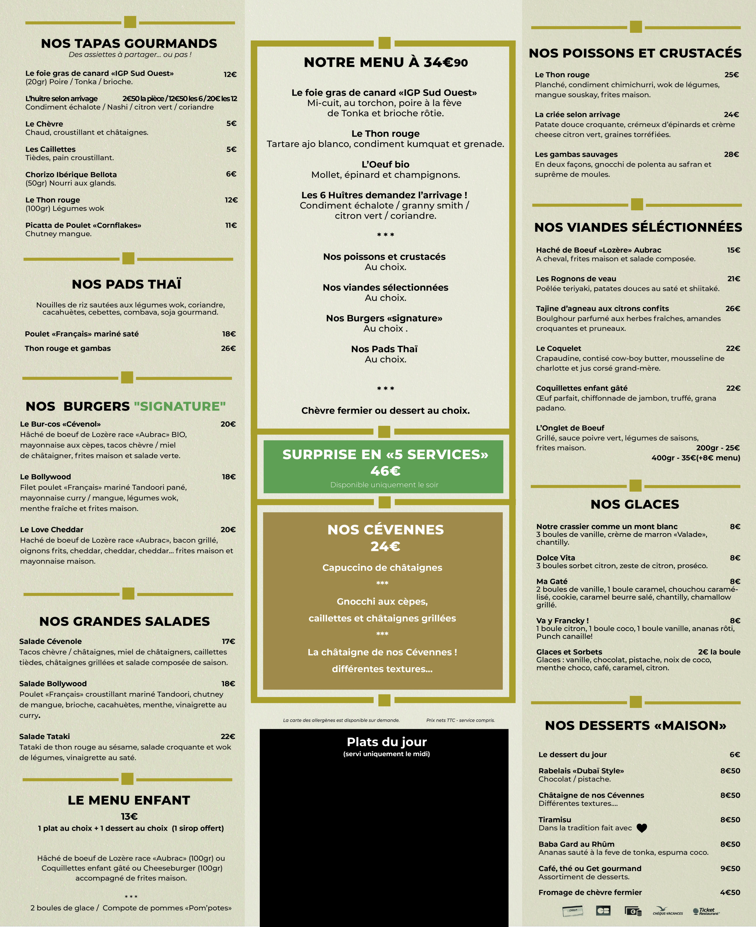 Salades et Burgers aux accents cévenols mais également d’exquis desserts maison qui ravira petits et grands, autour d’un verre de vin ou d’un jus bio artisanal.